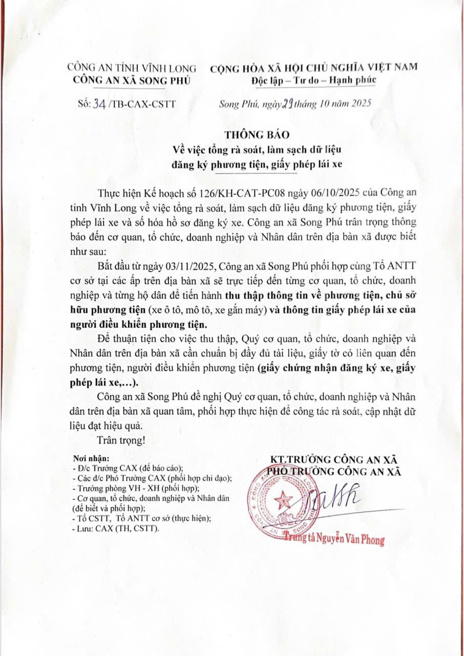Thông báo Về việc tổng rà soát, làm sạch dữ liệu đăng ký phương tiện, giấy phép lái xe